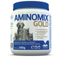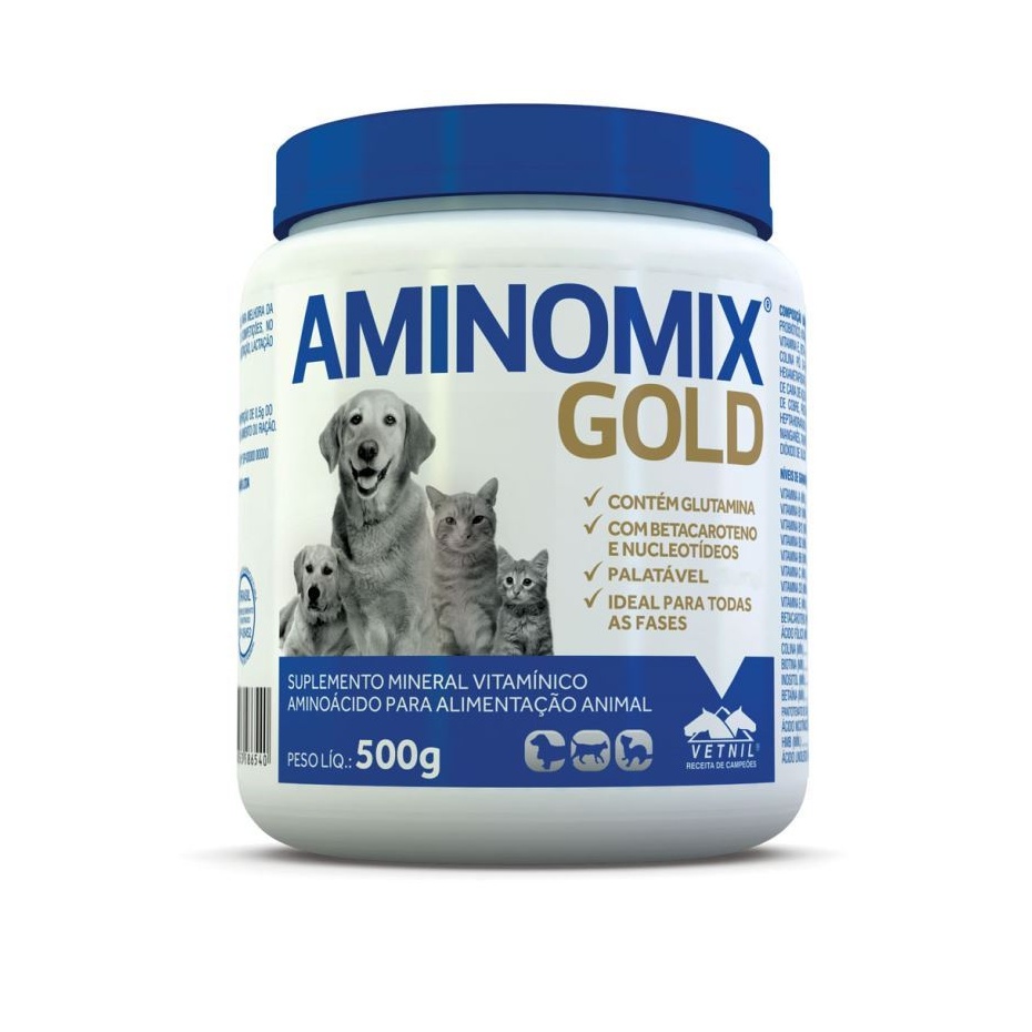 Aminomix Gold® possui uma formulação super premium, para melhora da qualidade da alimentação. Fornece doses essenciais de aminoácidos, vitaminas e minerais, além de componentes específicos que favorecem a saúde dos cães, gatos e mustelídeos, com o Betacaroteno, Nucleotídeos e a Glutamina.