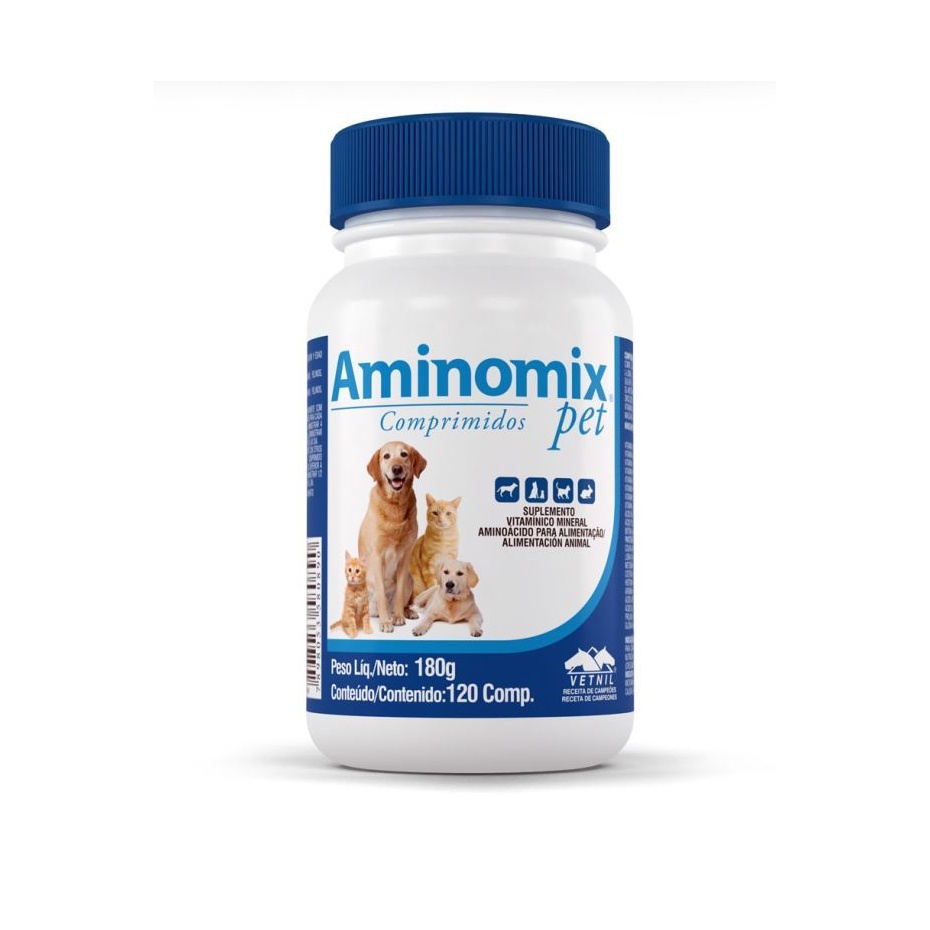 Aminomix® Pet Comprimidos fornece de forma prática as doses diárias de vitaminas, minerais e aminoácidos. A apresentação em forma de comprimidos facilita a dosificação.