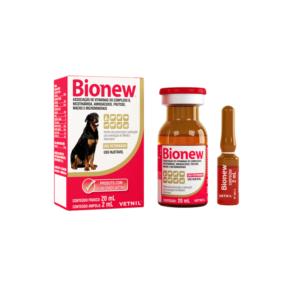 Bionew® é um complexo de vitaminas do complexo B, butafosfana e aminoácidos. É indicado para cães e gatos no tratamento dos estados carenciais dos ingredientes que compõem a fórmula do produto.