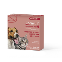 ANTIBIÓTICO DE AMPLO ESPECTRO A BASE DE ENROFLOXACINO, O ANTIBIÓTICO CHEMITRIL COMPRIMIDOS 50 MG É INDICADO PARA CÃES E GATOS NO TRATAMENTO DE INFECÇÕES CAUSADAS POR BACTÉRIAS GRAM-POSITIVAS E GRAM-NEGATIVAS.