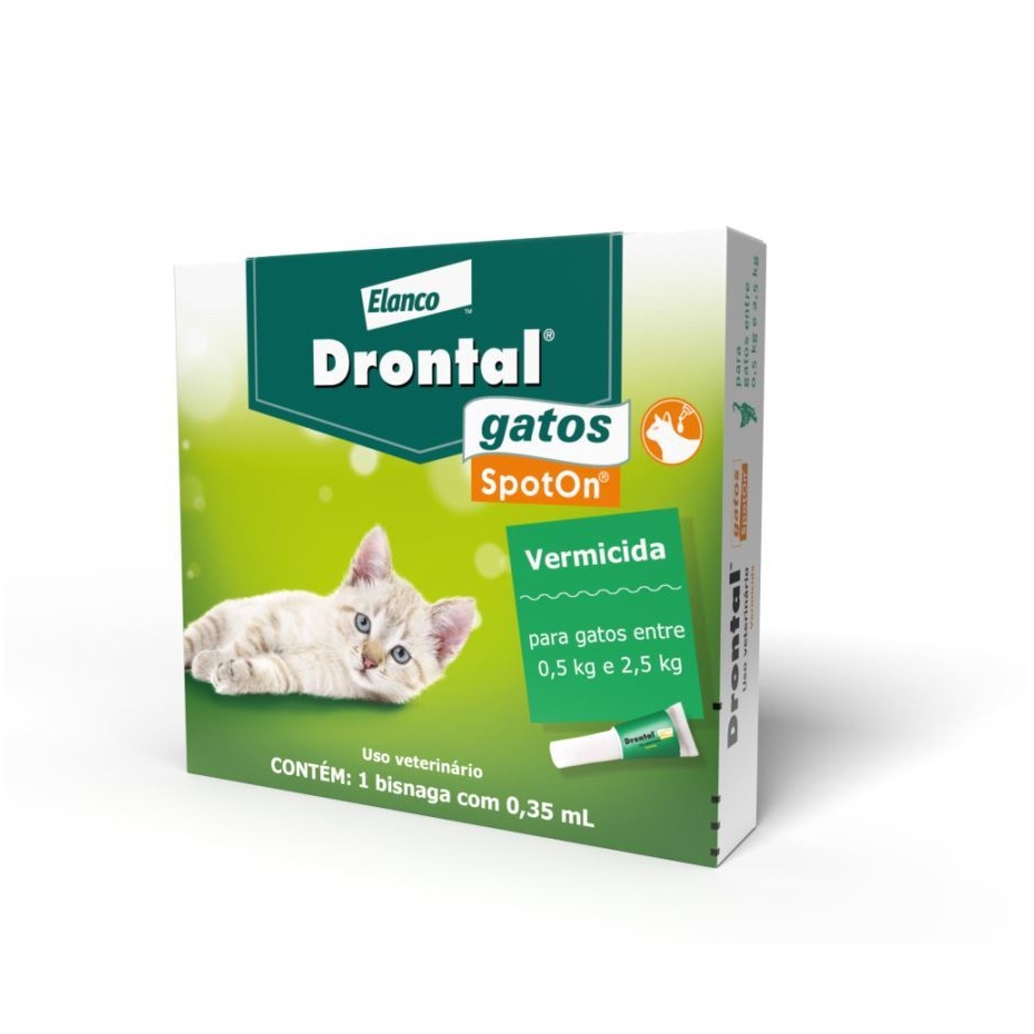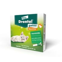 O DRONTAL SPOT ON E INDICADO PARA O TRATAMENTO E CONTROLE DAS VERMINOSES INTESTINAIS DOS GATOS. ESTE PRODUTO TEM TEM RAPIDA ACAO E COMBATE OS VERMES NAS FASES LARVAIS E ADULTAS, E EM UMA UNICA DOSE, GARANTE A SEGURANCA DO BICHANO. CONTEM UMA PIPETA.