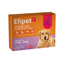 Efipet 3+ é um antiparasitário externo exclusivo para cães de todos os portes, indicado para animais a partir de 8 semanas de vida, de acordo com seu peso corporal. Com formulação avançada, Efipet 3+ oferece proteção eficaz contra pulgas, carrapatos e o mosquito transmissor da leishmaniose, proporcionando bem-estar e saúde para o seu pet.