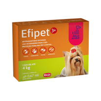 Efipet 3+ é um antiparasitário externo exclusivo para cães de todos os portes, indicado para animais a partir de 8 semanas de vida, de acordo com seu peso corporal. Com formulação avançada, Efipet 3+ oferece proteção eficaz contra pulgas, carrapatos e o mosquito transmissor da leishmaniose, proporcionando bem-estar e saúde para o seu pet.
