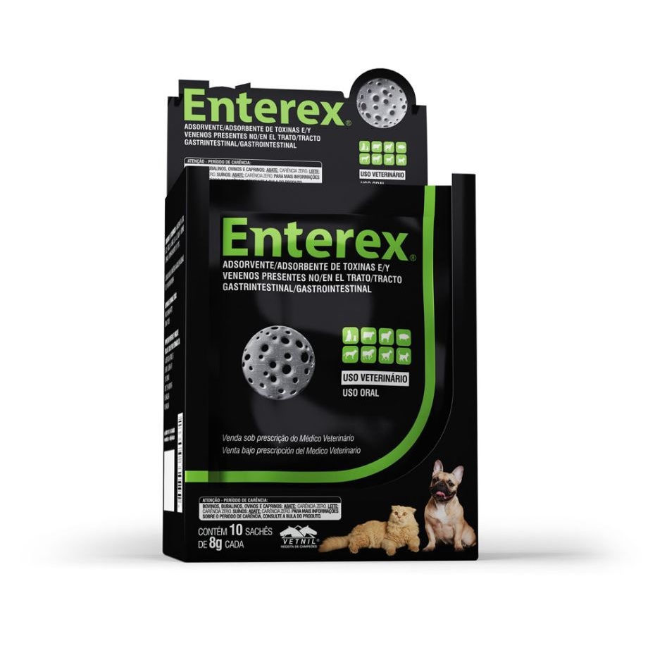 Enterex® está indicado como adsorvente de toxinas e venenos, presentes no trato gastrintestinal de cães e gatos, nos casos de envenenamentos, intoxicações diversas e tambem auxilia no tratamento de diarreias e gastroenterites.