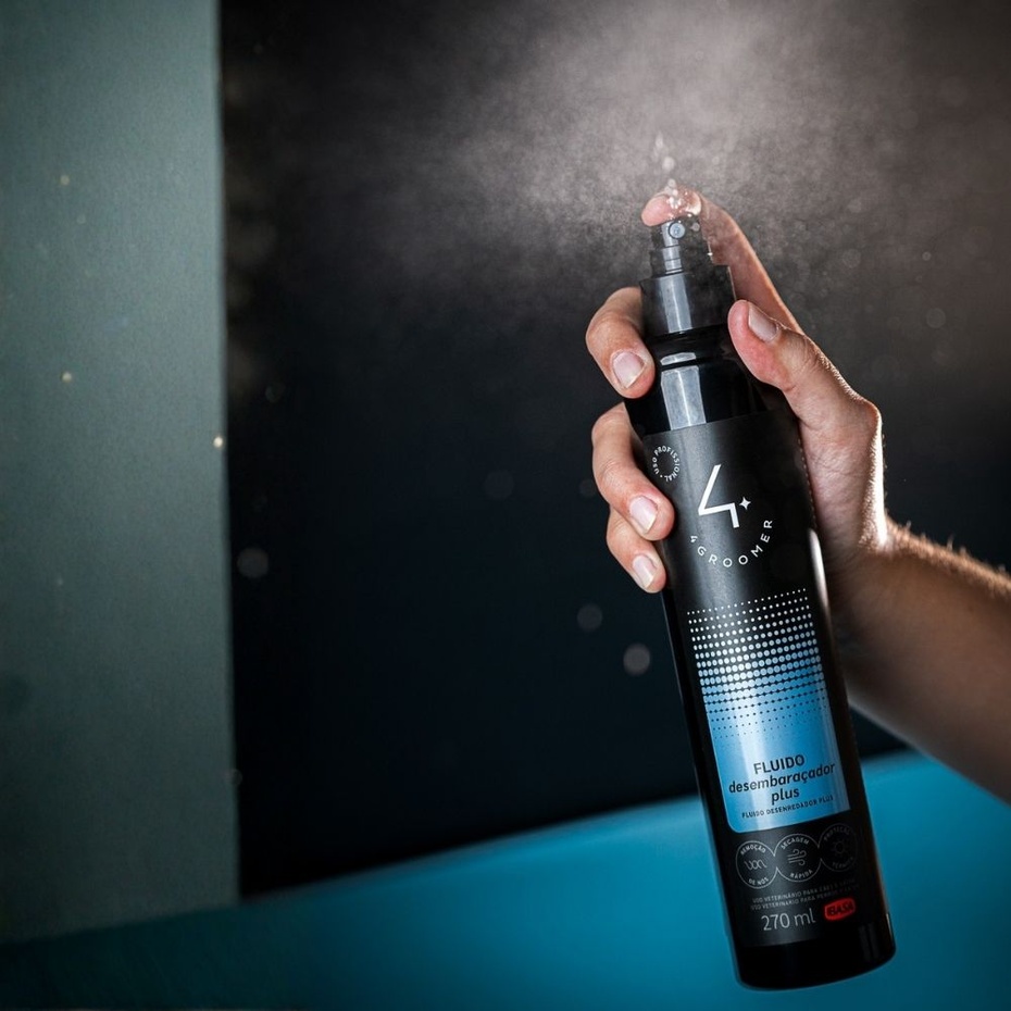 Fluido Spray Desembaraçador Plus. Perfeito para desembaraçar nós, diminuir o tempo de secagem, proteger do calor e dar brilho. Promove secagem rápida e condicionamento, melhorando a penteabilidade úmida e seca. Também atua como termoprotetor, sendo usado antes dos secadores e modeladores. Sua formulação não oleosa tem ação antifrizz e dá brilho à pelagem, apresentando um excelente resultado de toque.