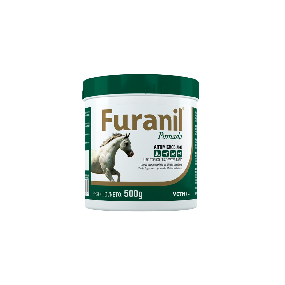 Furanil® solução e Furanil® pomada Indicado para equinos na profilaxia e tratamento das infecções bacterianas e fúngicas da pele e mucosas, órgãos genitais, piodermites, foliculites, pododermatites e micoses. Também está indicado para a assepsia de feridas, cortes, escoriações, abscessos, fístulas e ulcerações de decúbito.