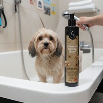 Após o banho, retirar o excesso de água do enxágue para aplicar o produto na pelagem úmida. Colocar a dose na palma da mão, fazer movimentos circulares com as mãos a fim de espalhar bem o produto nas palmas e dedos. Aplicar na pelagem a partir das pontas até a raiz, espalhando e massageando suavemente. Deixar agir por 10 segundos, enxaguar e secar bem. Somente uso externo.
