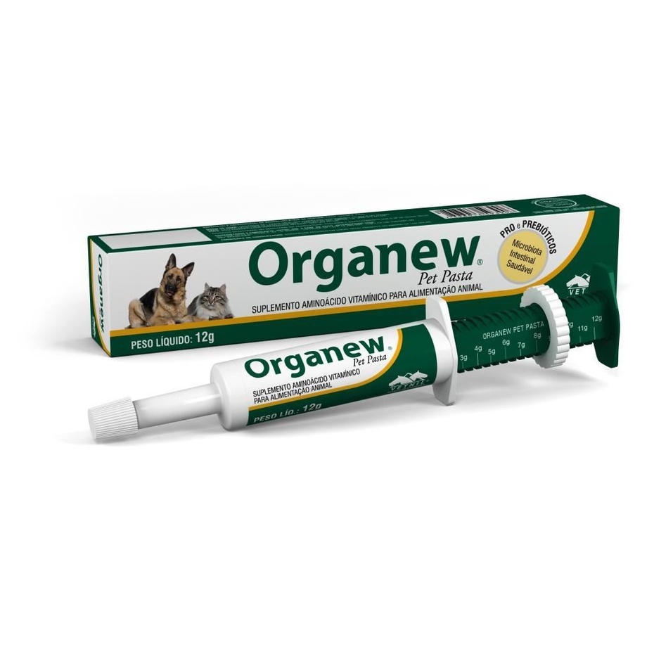 Organew® Pet Pasta é composto por vitaminas, aminoácidos e elementos pró e prebióticos para auxiliar no desenvolvimento e manutenção de uma microbiota intestinal saudável, contribuindo com a melhora da digestibilidade dos nutrientes da dieta e aumento da eficiência alimentar.
