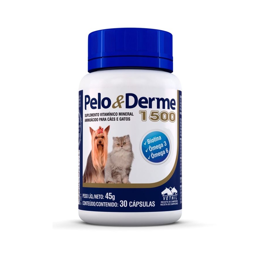 Suplemento contendo ácidos graxos essenciais, como Ômega 3 (Ácido Eicosapentaenóico e Ácido Docosahexaenóico) e Ômega 6 (Ácido Linoléico), vitaminas e minerais, os quais atuam na derme e pelos de cães e gatos. Indicado para o fortalecimento e manutenção da estrutura e função da pele e pelos dos animais.