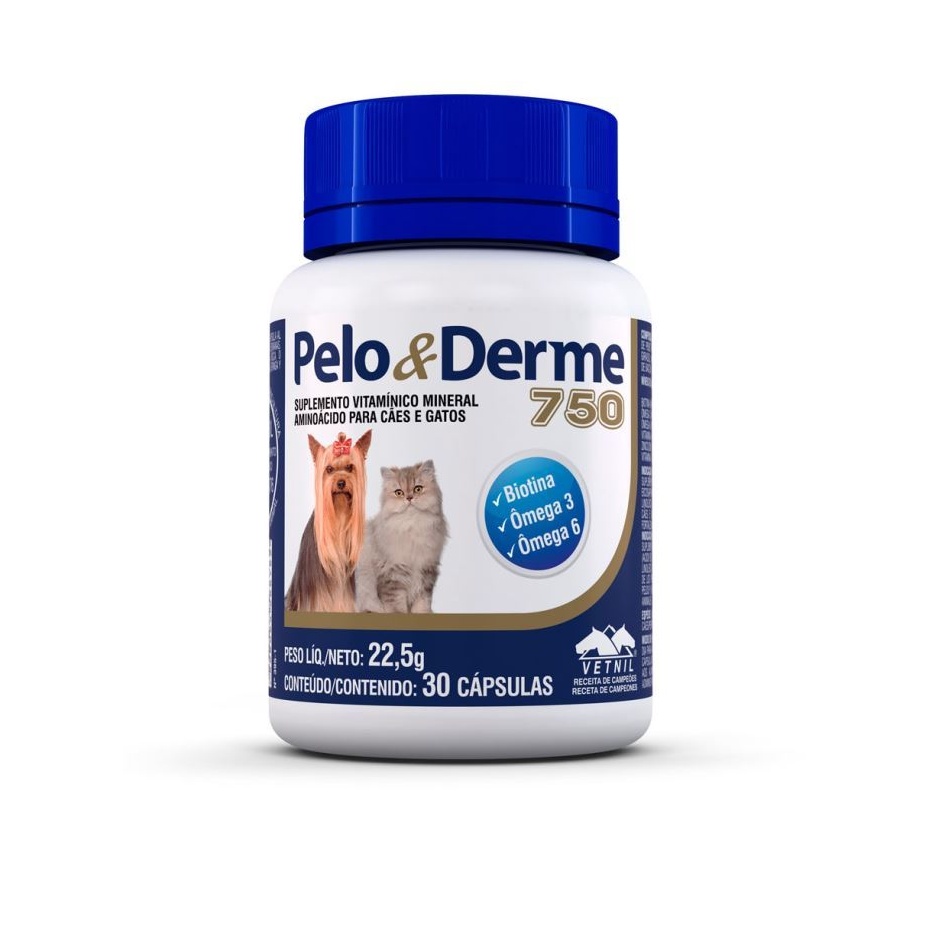 Suplemento contendo ácidos graxos essenciais, como Ômega 3 (Ácido Eicosapentaenóico e Ácido Docosahexaenóico) e Ômega 6 (Ácido Linoléico), vitaminas e minerais, os quais atuam na derme e pelos de cães e gatos. Indicado para o fortalecimento e manutenção da estrutura e função da pele e pelos dos animais.