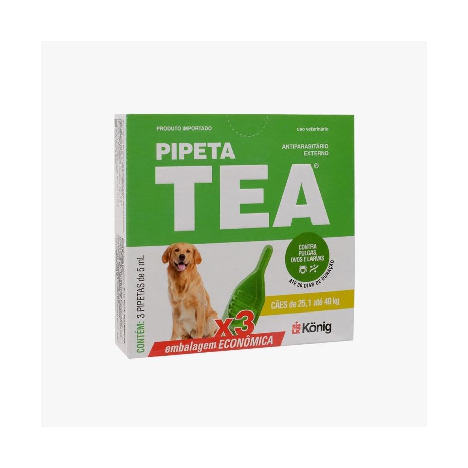 Pipeta Tea é uma solução pulguicida composta por ativos extremamente seguros e aplicados por via tópica em cães, variando a dose pelo peso indicado em cada embalagem.