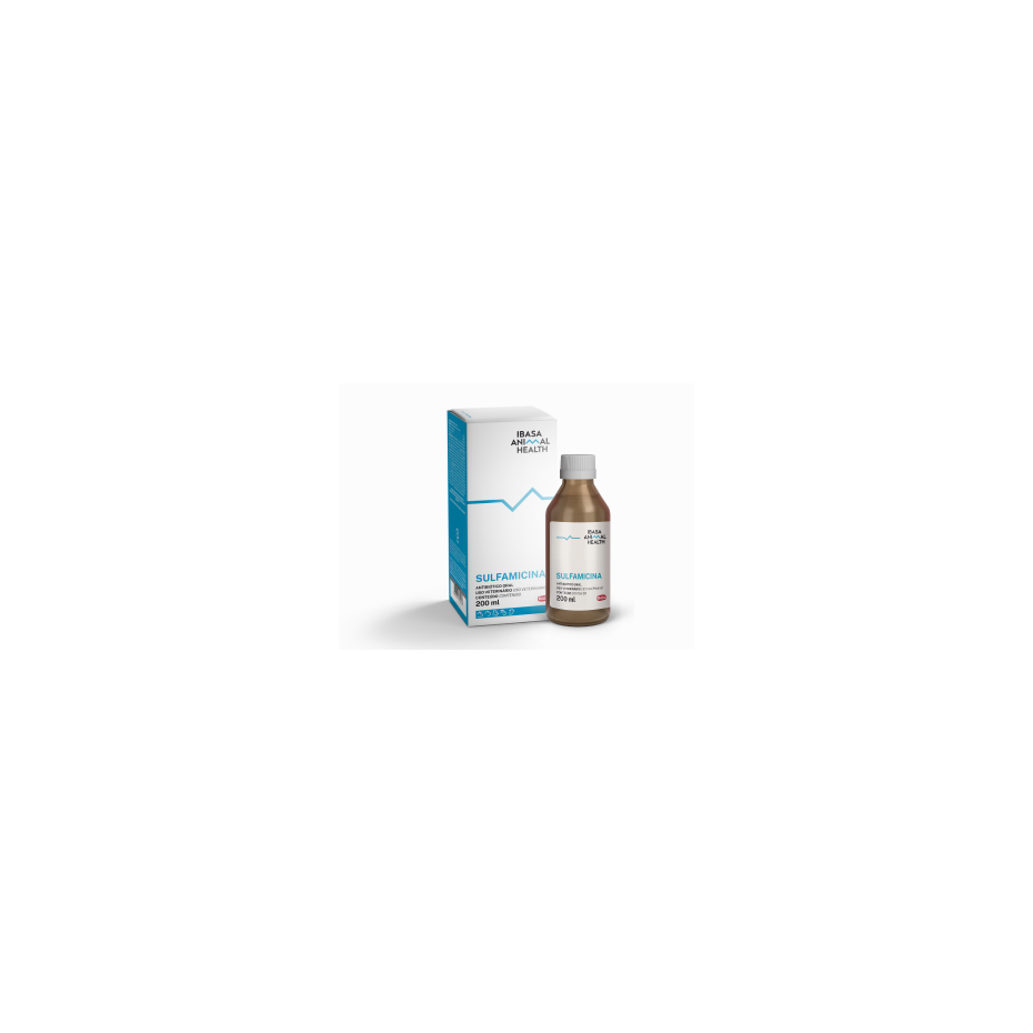 Sulfamicina Ibasa 200ml - Antibiótico Uso Oral de Sulfadimetoxina e Neomicina, tratamento de infecções como coccidiose dos frangos e perus (Eimeria sp.), cólera das aves (Pasteurella multocida), coriza contagiosa (Haemophilus gallinarum) e tifose aviária (Salmonella gallinarum).