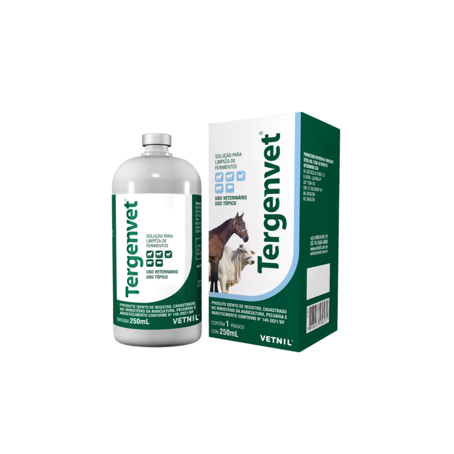 Tergenvet® é indicado para higiene e limpeza da pele integra e lesionada de equinos, bovinos, suínos, caprinos e ovinos.